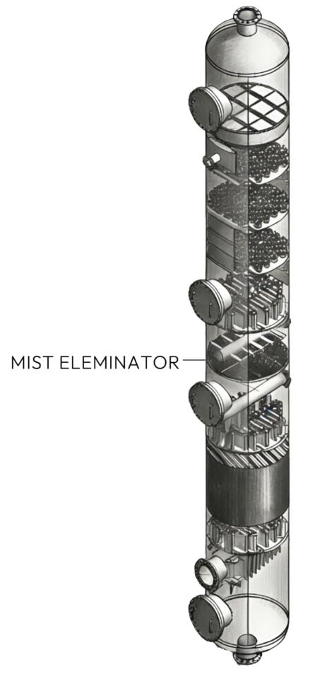 The most widely used mist eliminator in industrial applications is the knitted-wire-mesh type. These mesh eliminators consist of a pad of knitted wire mesh packed between two rigid grids for support.