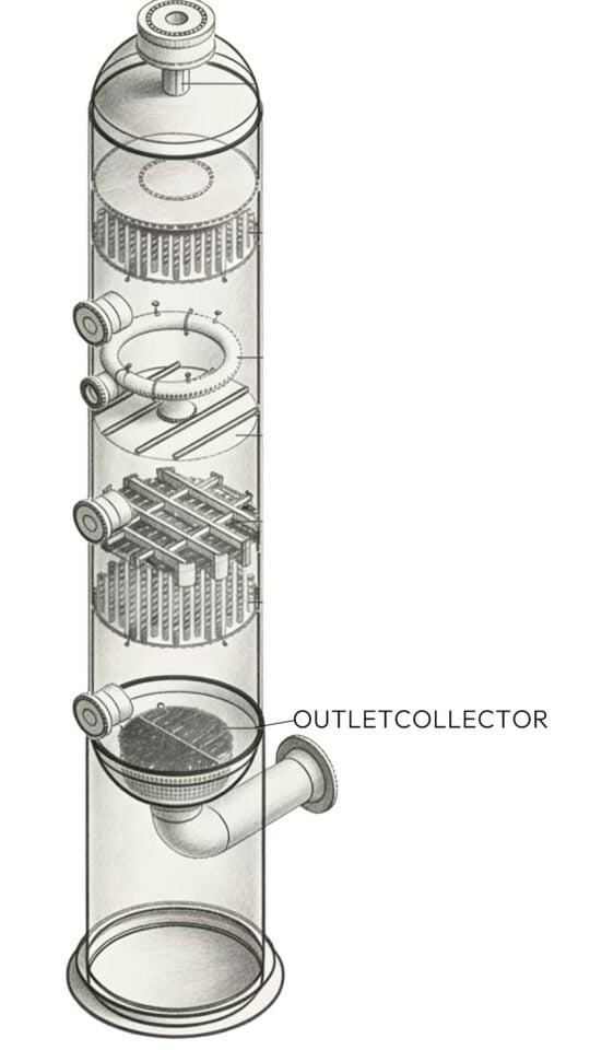 The design of the outlet collector can vary based on the vessel’s bottom head, process conditions, and fluid dynamics. While the cylindrical shape is the most commonly used, conical and hemispherical shapes are also viable options. Design considerations, such as catalyst unloading nozzles or access openings for cleaning, are often required and influence the outlet collector’s design. To enhance upstream flow, features like controlled open areas and deflectors are incorporated, with the goal of achieving as uniform a flow distribution as possible.